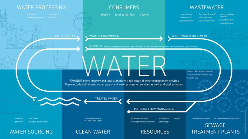 REMONDIS’ ultimate goal is to deliver a complete package of services – something that is illustrated perfectly by our water division. We can perform every single task that may be required by industrial businesses, local authorities and local inhabitants. From sourcing and producing process and drinking water all the way through to treating wastewater in sewage treatment plants or on site at our industrial customers. And all this accompanied by a wide range of innovations, state-of-the-art processes and customer-oriented services to help preserve our planet’s supplies of water and protect the environment. But why not take a closer look for yourself?!